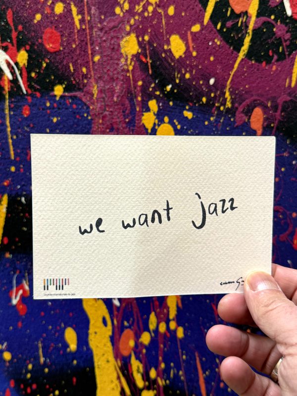 Distribution of postcards with jazz words to share and posters in public spaces: