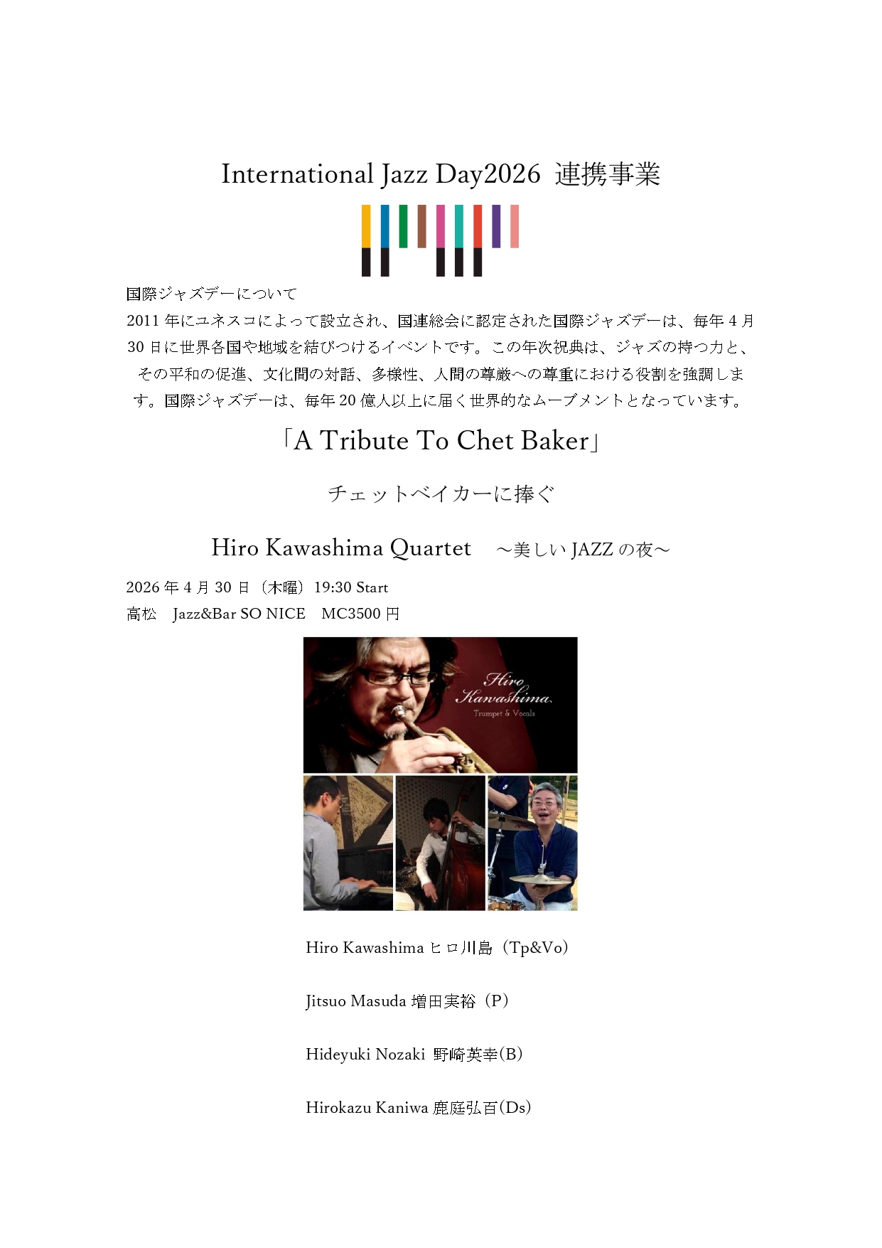 This will be an evening where HIRO KAWASHIMA, who has inherited the spirit of Chet Baker, and other wonderful musicians from Kagawa Prefecture, Japan, will share the charm of standard songs and improvisation. This event is dedicated to International Jazz Day by an organization that has long held music festivals in Takamatsu City, Kagawa Prefecture.