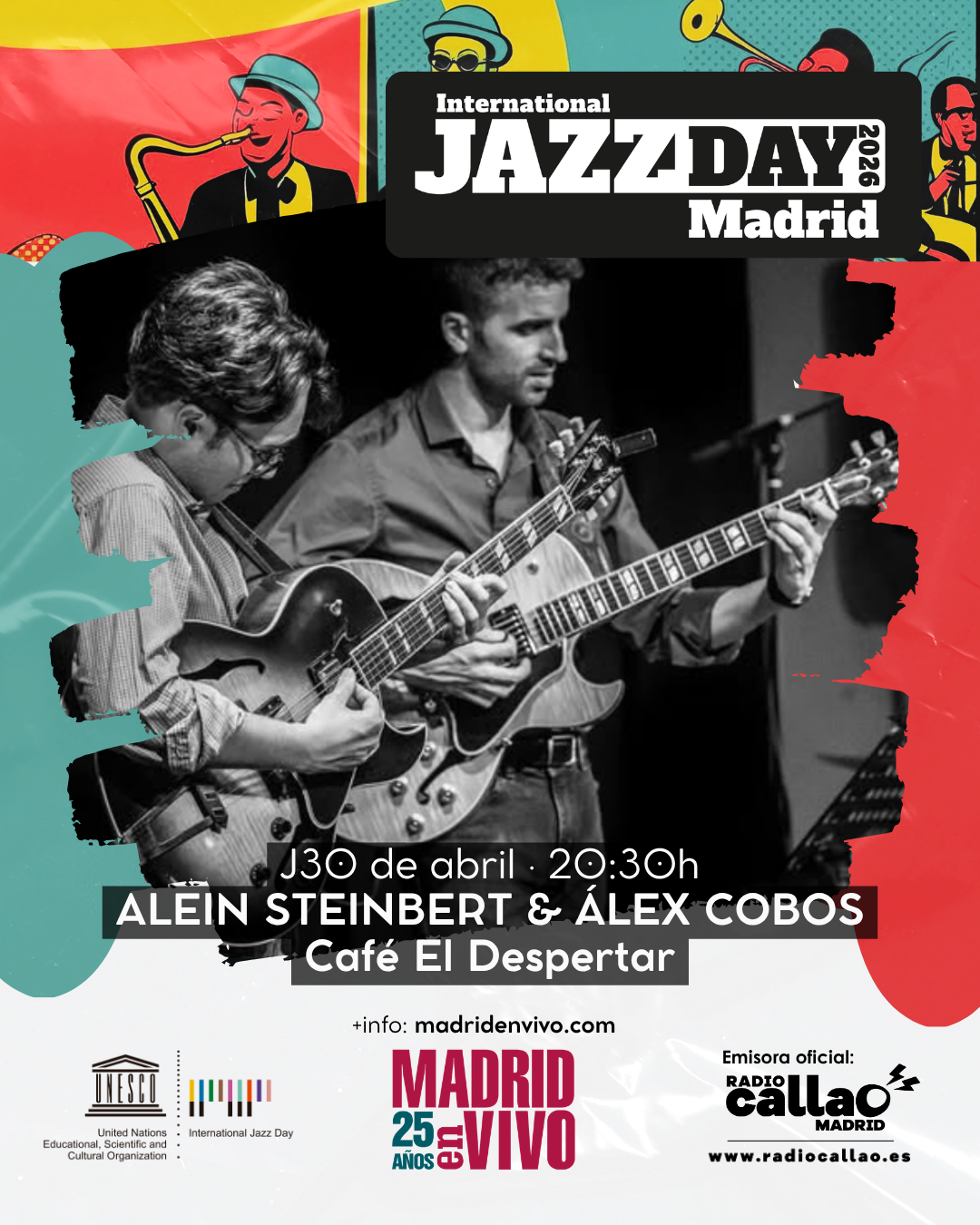 Alein Steinbert y Álex Gómez, habituales de la escena del jazz nacional, presentan un formato íntimo donde revisitan composiciones propias y estándares desde una mirada personal. El dúo se mueve entre el lenguaje del jazz y el post bop, con arreglos originales y un diálogo constante entre ambos músicos. Formados junto a referentes como John Scofield, Mike Stern o Peter Bernstein, Alein Steinbert y Álex Cobos reúnen una trayectoria que los conecta con figuras clave del jazz como Perico Sambeat o Lucía Martínez. Con un lenguaje propio y una presencia destacada en la escena actual.