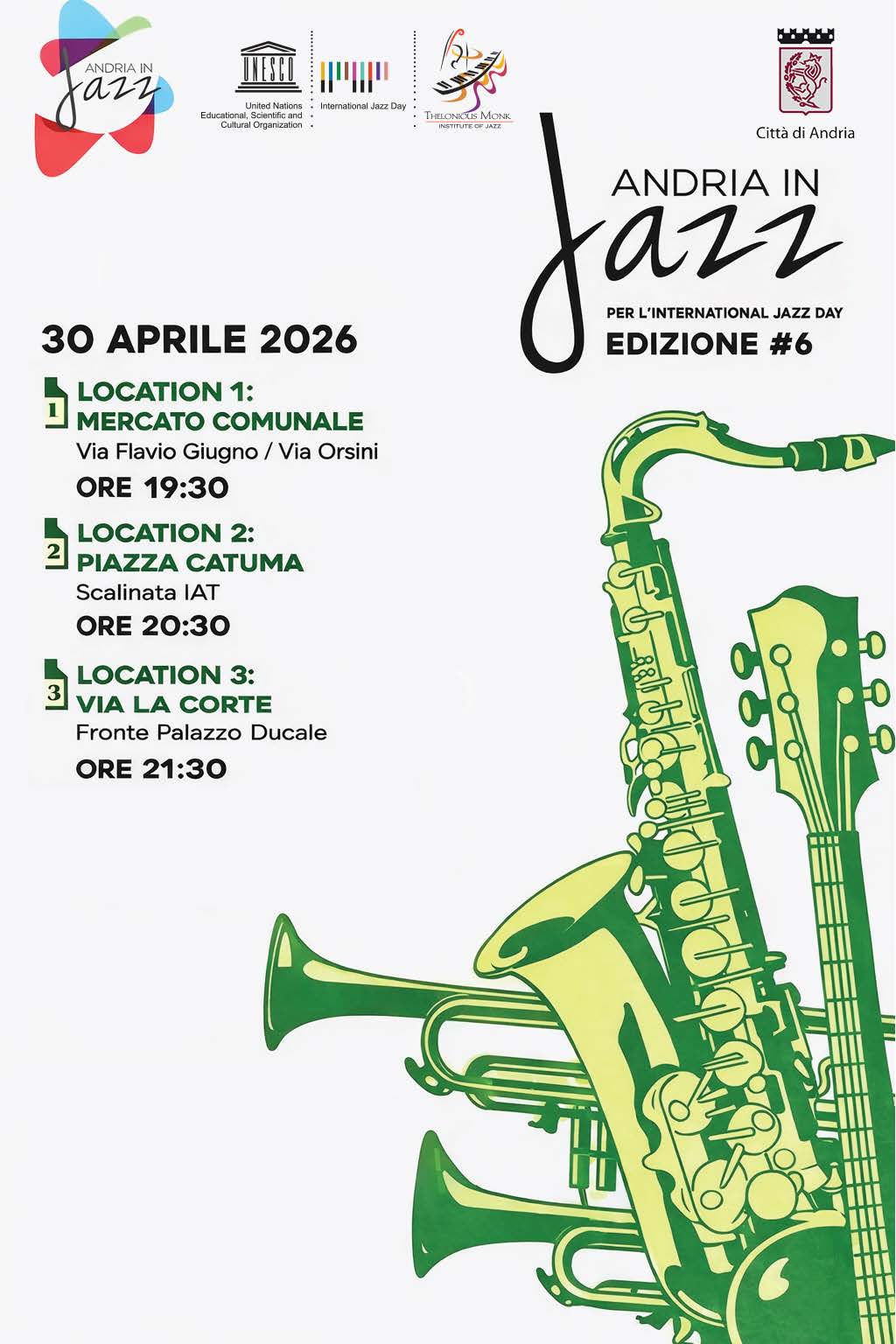 Andria in Jazz returns, the jazz tribute event that the city of Andria celebrates on the occasion of International Jazz Day, held on April 30th and recognized by UNESCO, which has declared jazz a heritage of humanity.