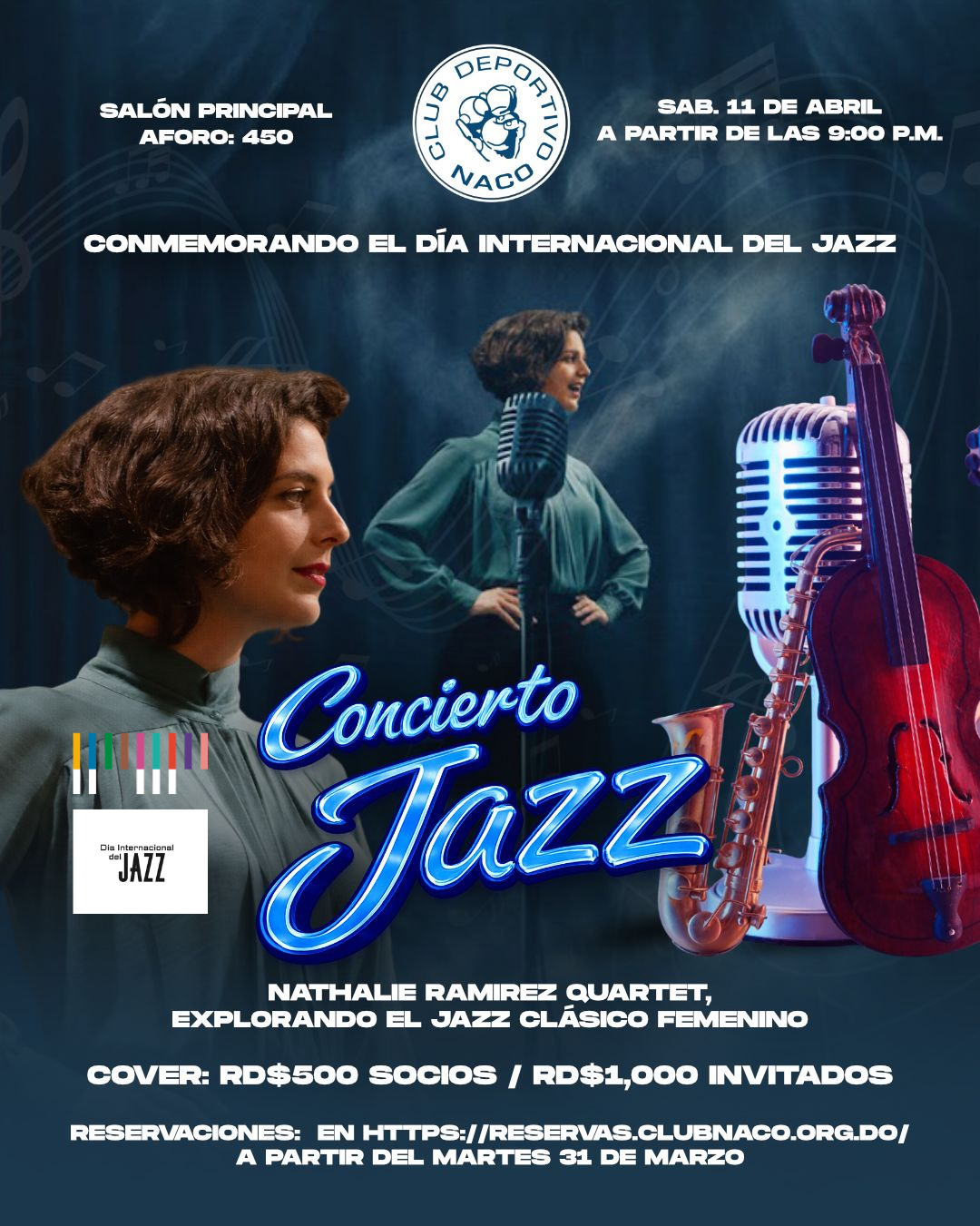 Let's celebrate International Jazz Day with Nathalie Ramirez Cuartet. The Naqueño family will enjoy an excellent night of Jazz at the highest level, in a festive atmosphere.