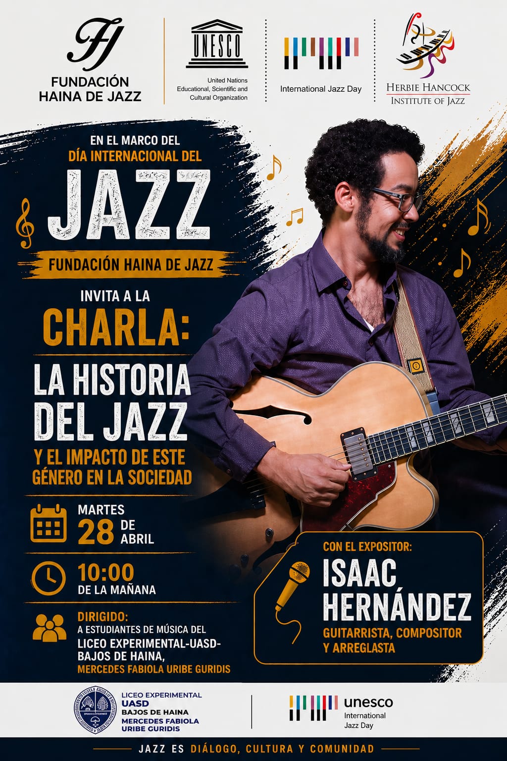 Esta será una charla, para compartir con estudiantes de música del Liceo Experimental Mercedes Fabiola Uribe Guridis, de la Universidad Autónoma de Santo Domingo (UASD) en Bajos de Haina. Donde compartiremos con ellos sobre la Historia del Jazz e impacto de este género en la sociedad. Colocaremos videos, para que estos estudiantes tengan un acercamiento de algunas fusiones con géneros autóctonos de República Dominicana.