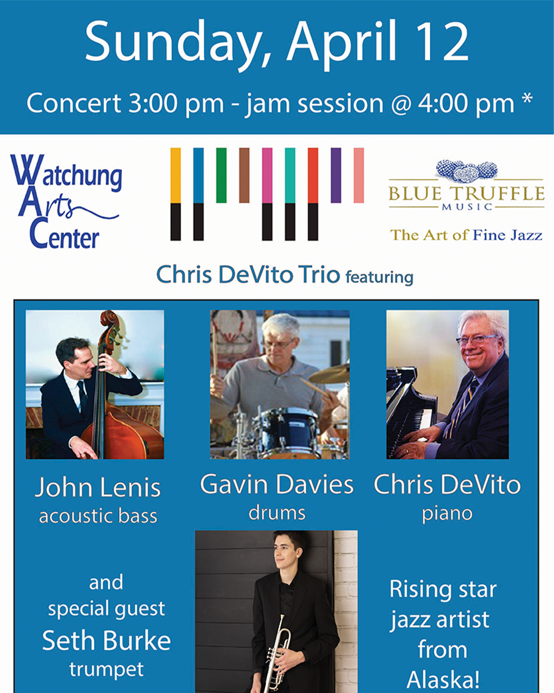 The concert will feature John Lenis on bass, Gavin Davies on drums, and Chris DeVito on piano, with special guest trumpeter Seth Burke. Burke is a visiting jazz artist from Alaska and a current jazz and classical performance student at William Paterson University. The program will conclude with a jam session beginning at 4:00 p.m., bringing together students from local music schools and veteran jazz artists from the region.