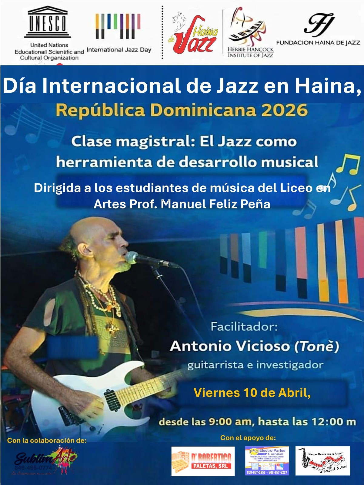 Clase magistral, El Jazz como herramienta de desarrollo musical, con la facilitación del guitarrista, investigador, compositor y profesor Antonio Vicioso (Toné) dirigida a estudiantes de música en el liceo en Artes profesor Manuel Féliz Peña, el jueves 10 de abril, en el municipio Bajos de Haina, desde las 9:00 de la mañana, a las 12:00 del mediodía.