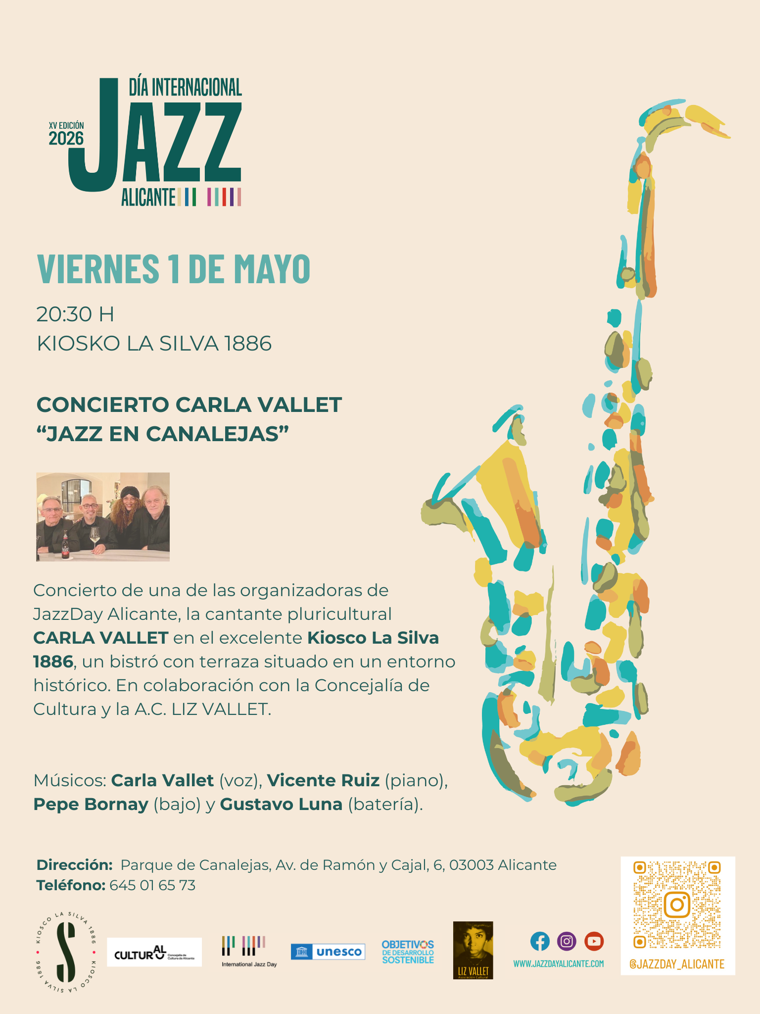 Concierto de una de las organizadoras de JazzDay Alicante, la cantante pluricultural CARLA VALLET en el excelente Kiosco La Silva 1886, un bistró con terraza situado en un entorno histórico.