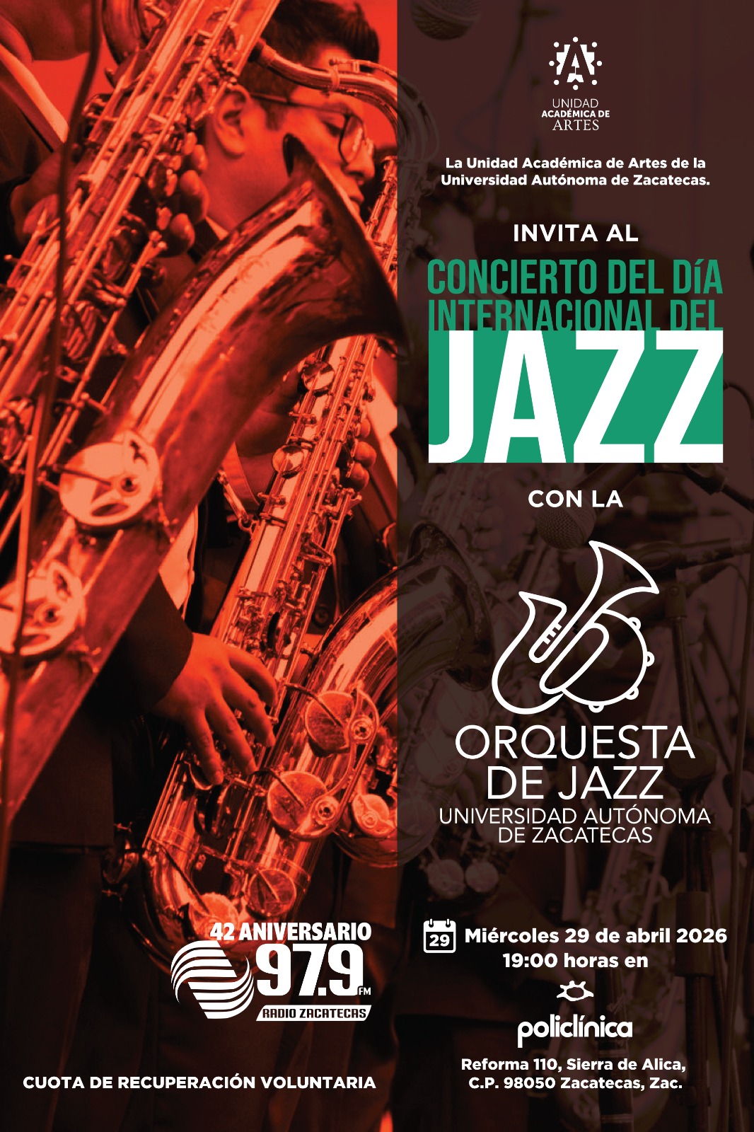 La Orquesta de Jazz de la Universidad Autónoma de Zacatecas, es una banda de jazz en formato "big band" de reciente creación, que conjuga el talento de alumnos y profesores de la universidad. Esta ocasión suman esfuerzos para presentar un concierto por el día internacional del jazz como un esfuerzo por difutir los valores que el jazz promueve.