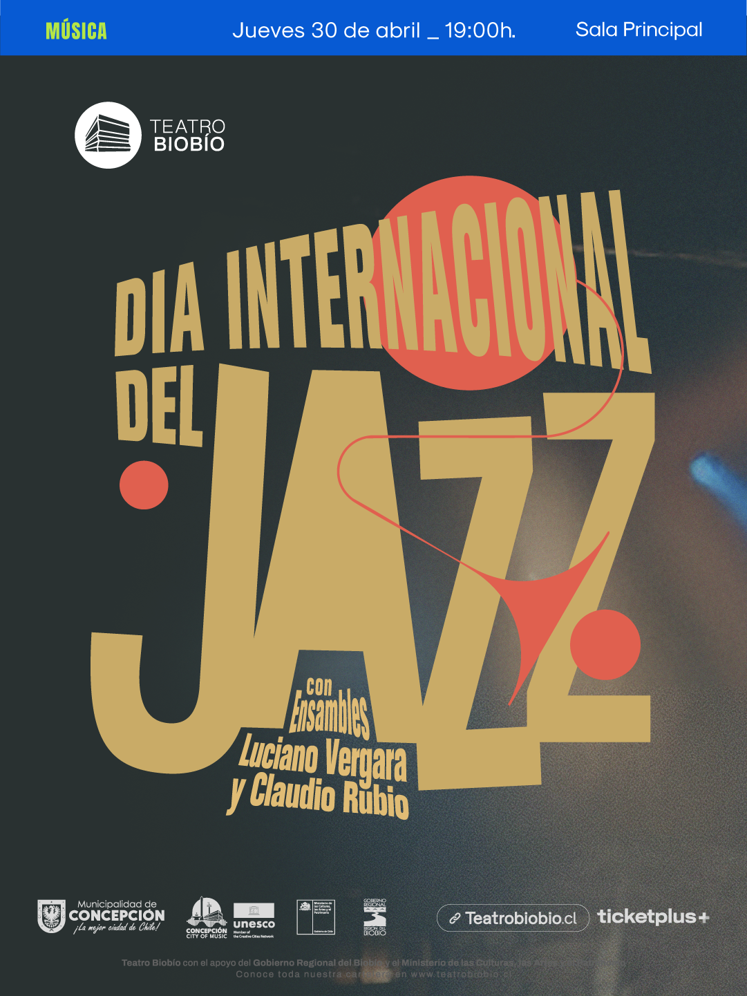 Teatro Biobío celebra una nueva edición del Día Internacional del Jazz el 30 de abril en la Sala Principal que incluye una masterclass abierta al público y un concierto con destacados exponentes del jazz nacional.