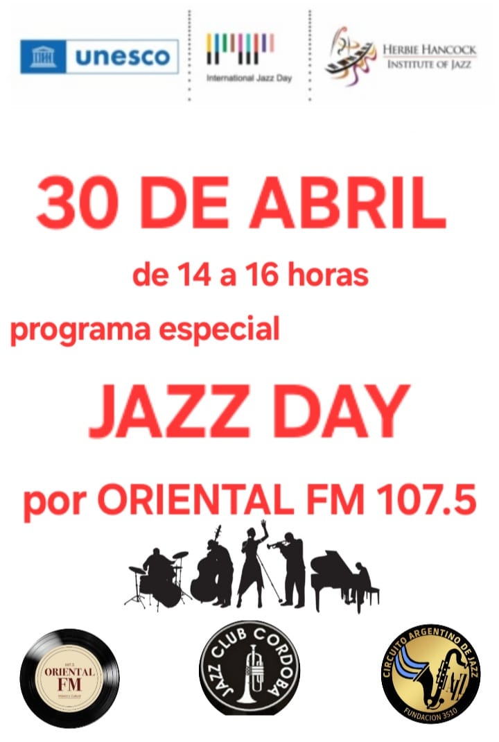 El jueves 30 de abril de 14 a 16 horas, el Jazz Club Córdoba y Oriental FM 107.5 realizaran un programa radial especial sobre el Jazz Day. Tendremos músicos invitados y las mejores grabaciones de Jazz.