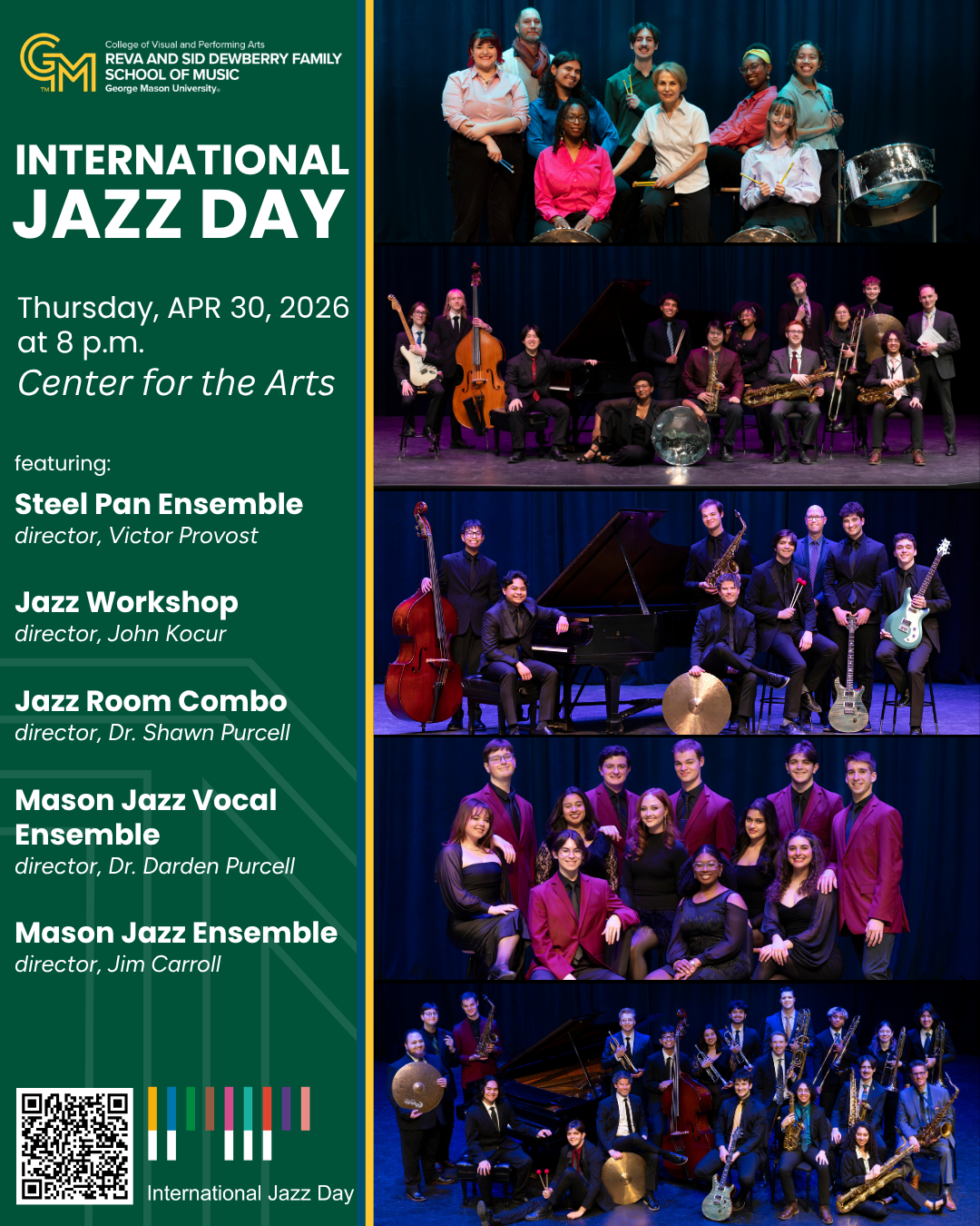 International Jazz Day will take place on Thursday, April 30, 2026, at 8 p.m. in the Center for the Arts at George mason University! Join us as we come together with the global community to celebrate International Jazz Day, a worldwide initiative led by UNESCO (the United Nations Educational, Scientific and Cultural Organization). This annual event unites people across cultures, countries, and generations through the power of jazz—honoring its roots, envisioning its future, and recognizing its profound impact on humanity. Featuring 5 incredible groups: Steel Pan Ensemble (Victor Provost), Jazz Room Combo (Shawn Purcell), Jazz Workshop (John Kocur), Mason Jazz Vocal Ensemble (Darden Purcell) and the Mason Jazz Ensemble (Jim Carroll).