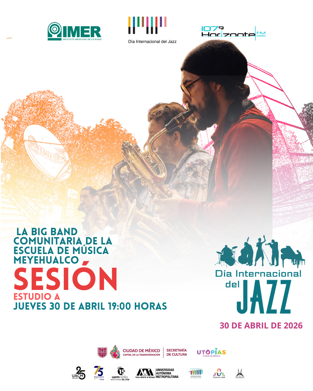 Horizonte 107.9 fm celebra el Día del Jazz con la presentación en el Estudio A de IMER de la Big Band Comunitaria de la Escuela de Música Meyehualco que forma parte del proyecto de iniciación educativa musical de la Utopía Meyehualco
