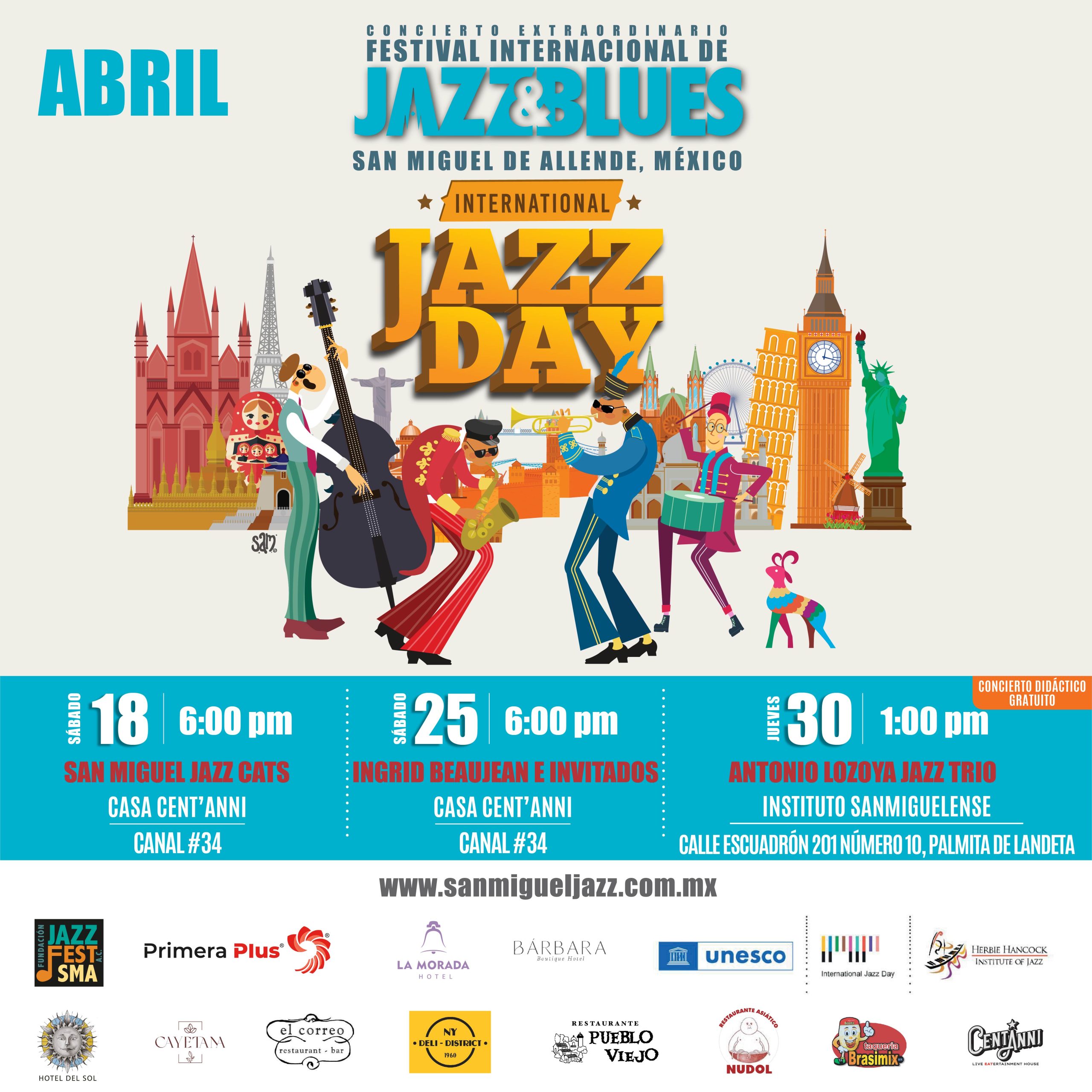 In April, the 32nd San Miguel de Allende International Jazz and Blues Festival in Guanajuato, Mexico, will present three concerts in celebration of International Jazz Day.