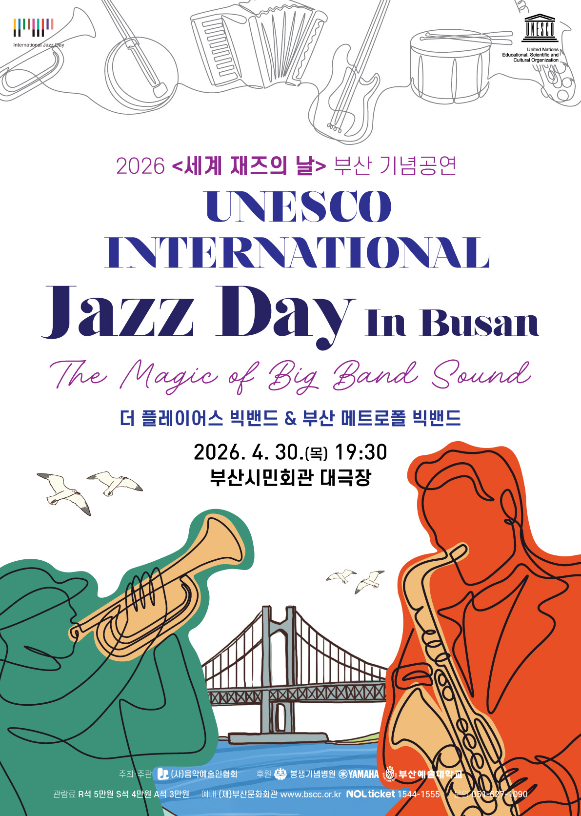 International Jazz Day Busan 2026 is a big band jazz concert in Busan, South Korea, celebrating UNESCO International Jazz Day. Held at Busan Citizen’s Hall (Grand Theater), the event features The Players Bigband and the Busan Metropol Big Band under the theme “The Magic of Big Band Sound.” The program includes separate sets by each band, followed by a joint grand finale that highlights jazz as a spirit of connection, harmony, and cultural dialogue.