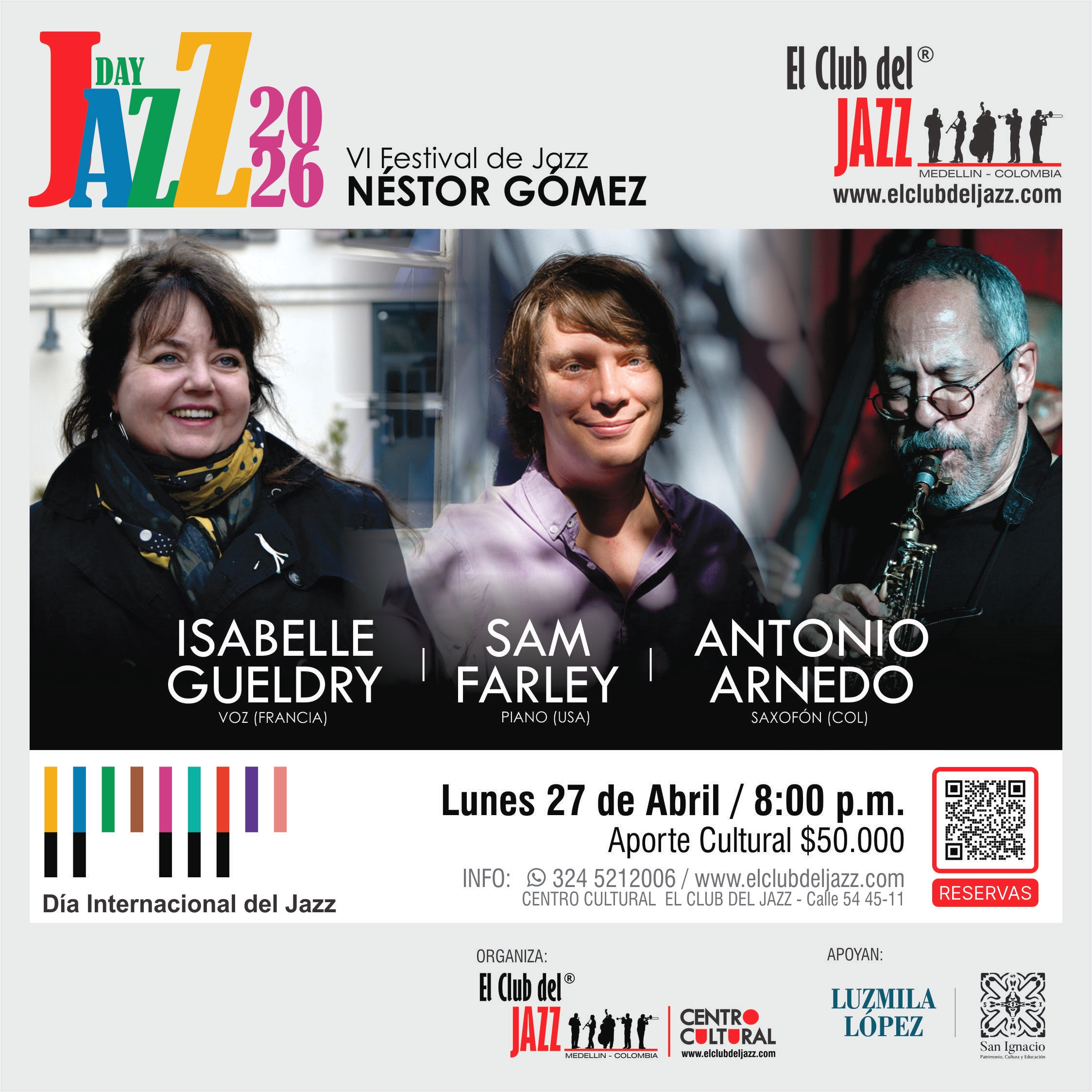 El Club del Jazz presenta una noche de encuentro multicultural: más que un concierto, un diálogo entre tradiciones que celebran el lenguaje universal de la improvisación. El lunes 27 de abril, el Centro Cultural El Club del Jazz reunirá en Medellín a tres destacados artistas de Colombia, Europa y Estados Unidos. La cantante francesa Isabelle Gueldry, reconocida por su versatilidad, transita entre la chanson y el jazz contemporáneo con gran sensibilidad. El pianista estadounidense Sam Farley aporta una técnica impecable y una visión moderna del género. Completa el encuentro el saxofonista colombiano Antonio Arnedo, figura clave del jazz nacional y pionero en integrar sonoridades tradicionales con la improvisación