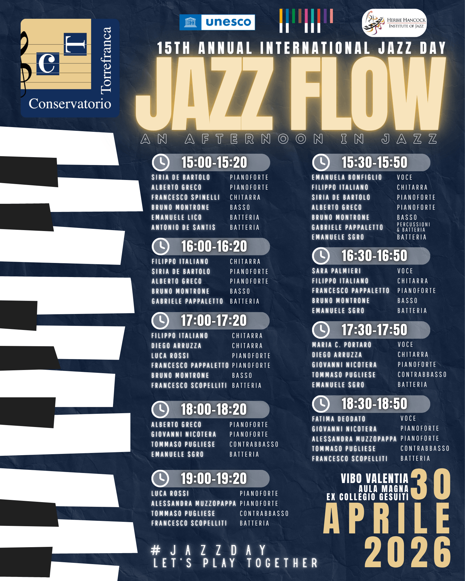 Nell’Aula Magna dell’ex Collegio dei Gesuiti — oggi Conservatorio Fausto Torrefranca — si susseguiranno numerosi concerti in un flusso che attraversa l’intero pomeriggio e costruisce, passo dopo passo, un’unica grande esperienza sonora, animata da oltre 20 musicisti.