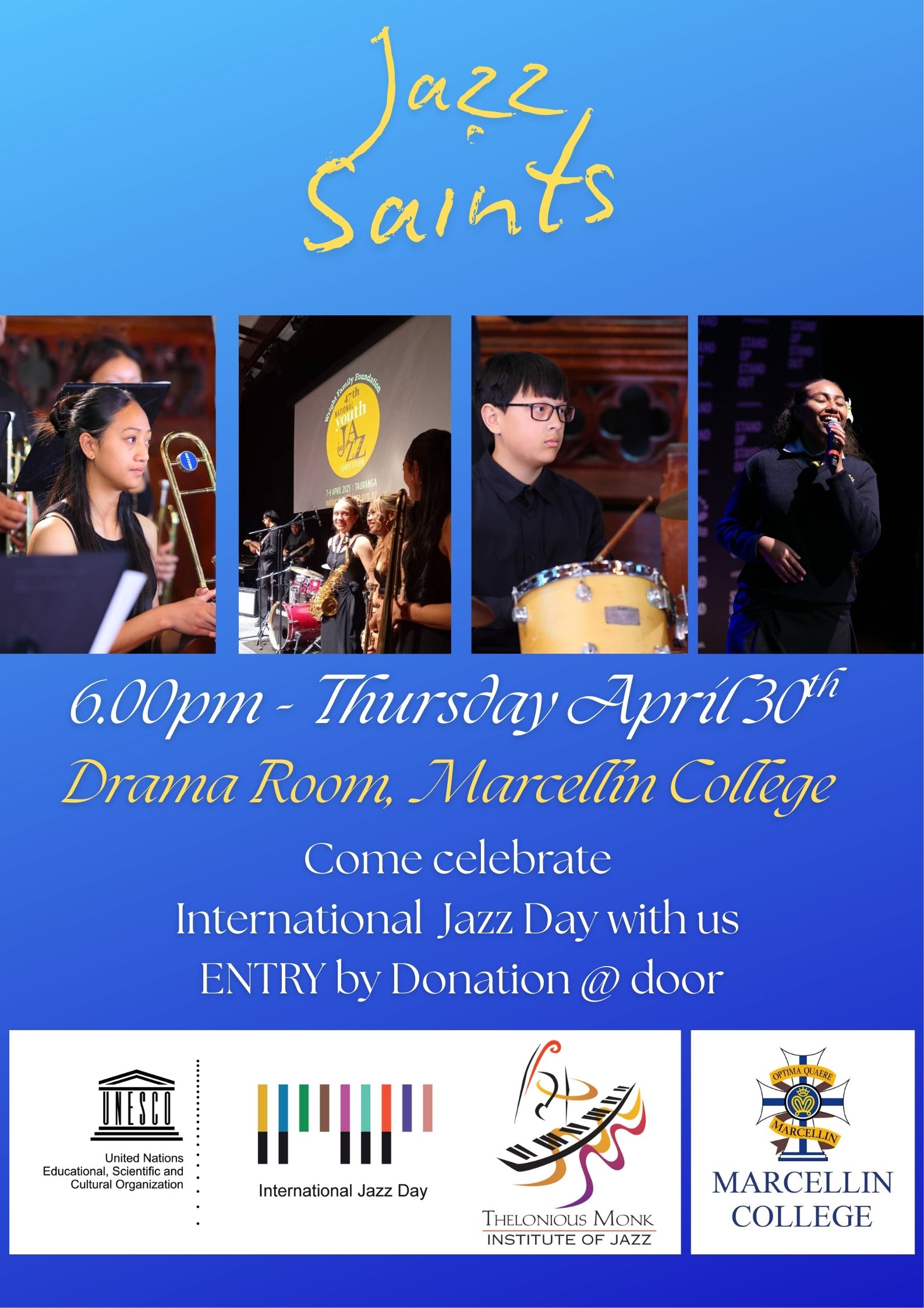 An evening of live Jazz presented by students of Marcellin College, Auckland, NZ. Organised and mentored by Dr Opeloge Ah Sam who is the Head of Music at Marcellin College. With some special guests - helping to celebrate International Jazz Day at Marcellin College.