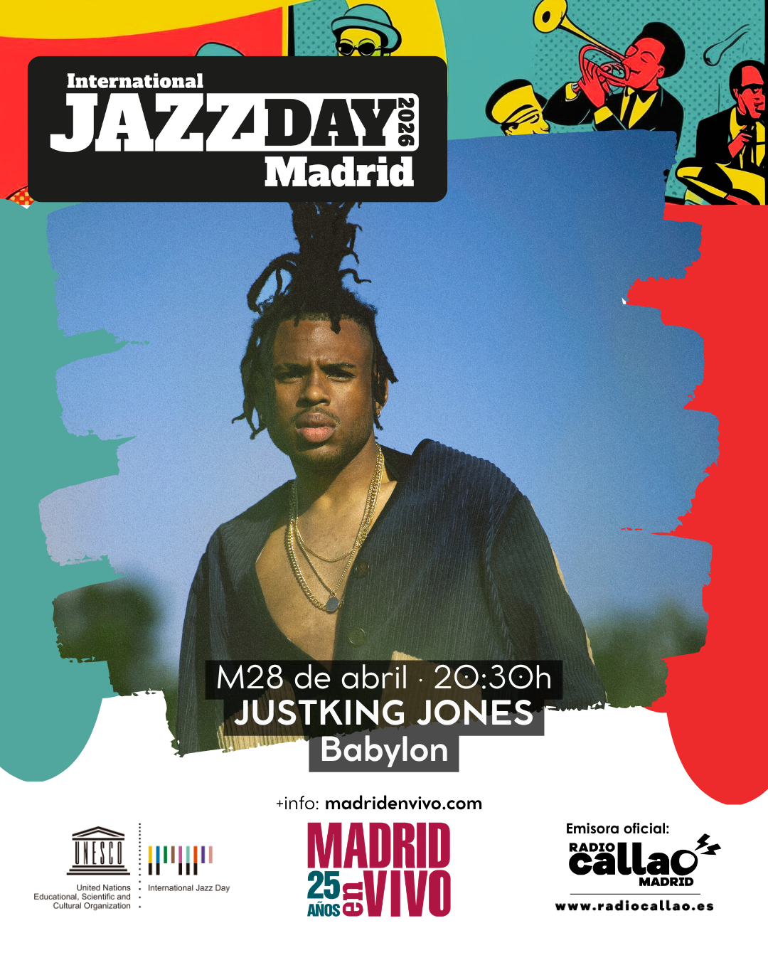 JustKing Jones es un saxofonista, compositor y productor jamaicano de Nueva Jersey, conocido por un sonido que se mueve con naturalidad entre géneros, escenas y fronteras. Enraizado en el jazz y el soul, y moldeado por el hip hop, los ritmos globales y la producción contemporánea, su música combina profundidad técnica con un fuerte sentido de propósito. Ha girado y actuado por todo el mundo junto a artistas como Ms. Lauryn Hill, Wyclef Jean, Gorillaz, Yasiin Bey, Hypnotic Brass Ensemble y Talib Kweli, además de colaborar con el ganador del Grammy Bilal. Su obra transmite una voz distintiva, espiritual y anclada en el groove. Con una visión centrada en la comunidad, utiliza la música como una fuerza unificadora.