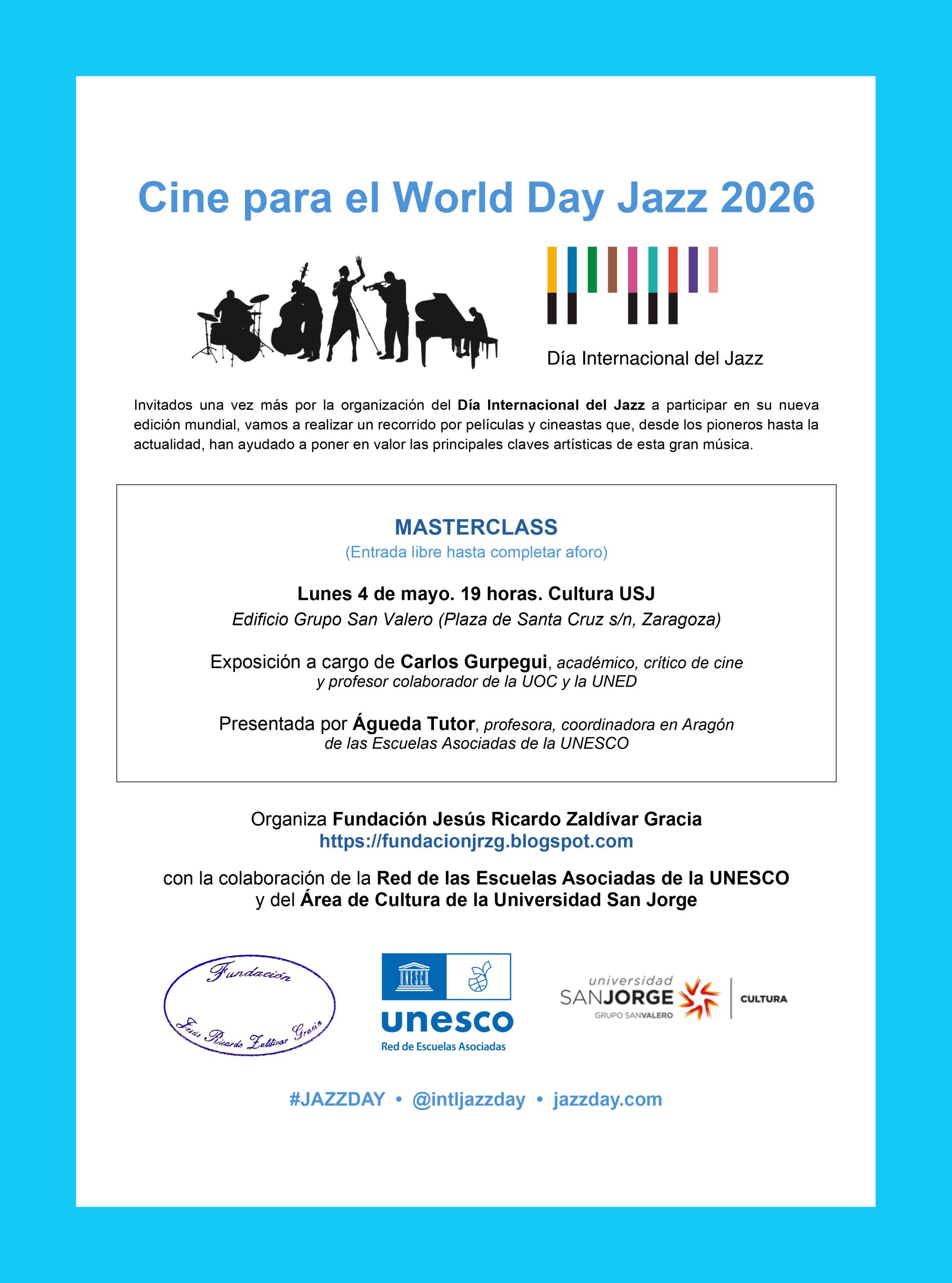 La Fundación Jesús Ricardo Zaldívar Gracia lleva participando en este Día desde 2018 con los Centros de Música Santa María. Este año lo hace en solitario con dos actividades: la escolar del 30 de abril, y una Master Class, el 4 de mayo abierta al público en la que realizaremos un recorrido por películas y cineastas que, desde los pioneros hasta la actualidad, han ayudado a poner en valor las principales claves artísticas de esta gran música que es el Jazz. La exposición será a cargo de Carlos Gurpegui, académico, crítico de cine y profesor colaborador de la UOC y la UNED. Presentada por Águeda Tutor, profesora, coordinadora en Aragón de las Escuelas Asociadas de la UNESCO.