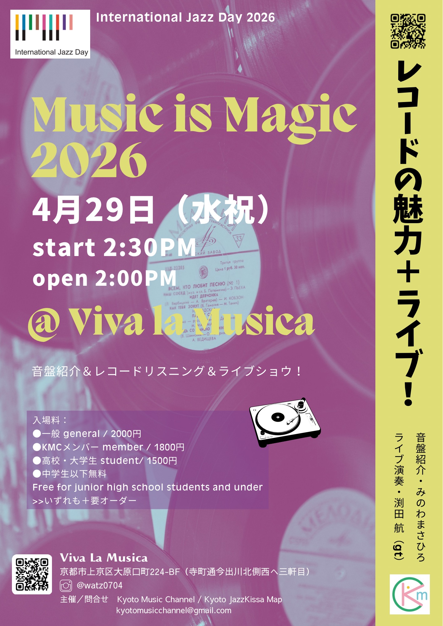 The venue is "Viva La MUSICA!", a beloved and renowned venue in Kyoto's world music scene.