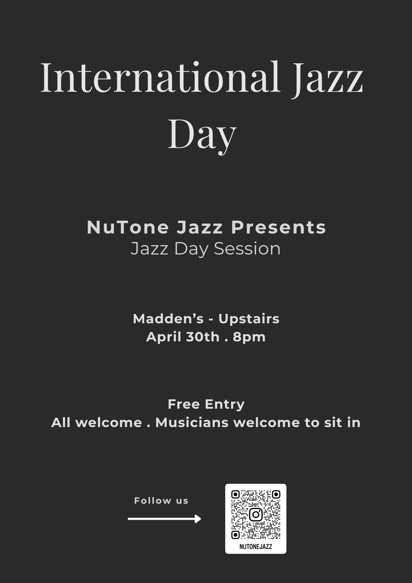 NuTone Jazz present a relaxed International Jazz Day session upstairs at Madden’s. The evening begins with a short set from NuTone Jazz, followed by a curated open session featuring local musicians and guest performers.