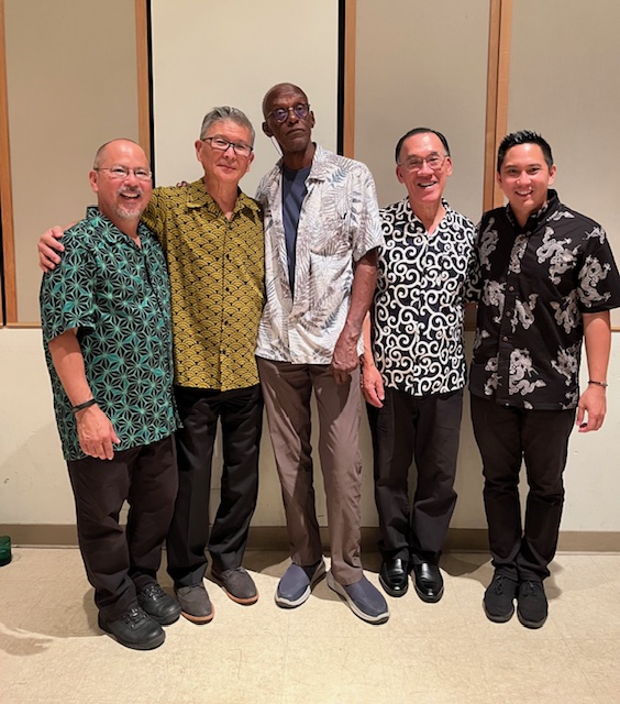 Ohana Jazz is a monthly performance put on by Noel & Liane Okimoto. It is held at the Musicians’ Association of Hawaii Local 677, Studio 909. It was started in October 2022 and features Tommy James – piano, Allen Won – saxophones, Dean Taba – bass, Abe Lagrimas Jr. – vibraphone, and Noel Okimoto on drums.