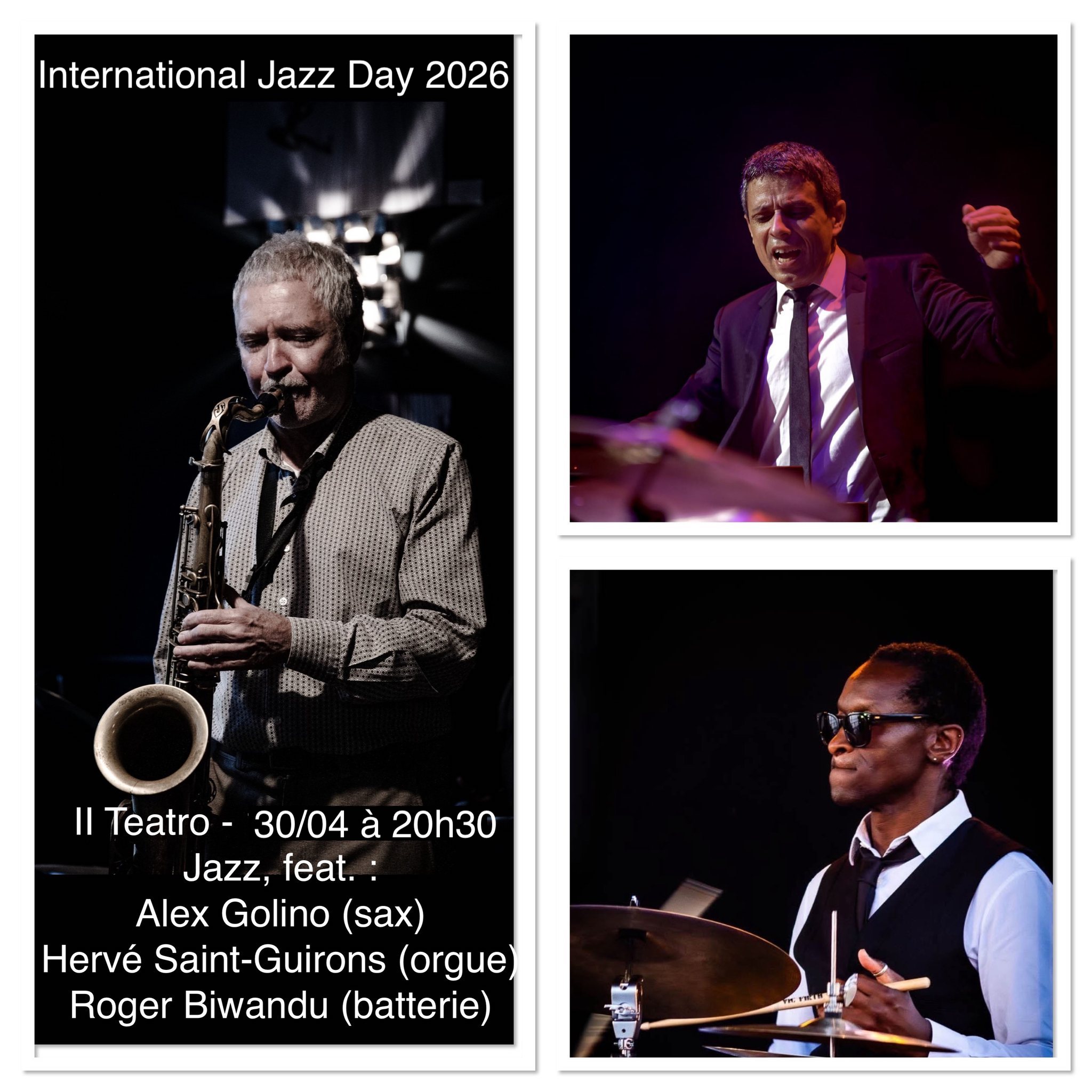 Roger played with Joe Zawinul, Marcus Miller, John Beasley, Lee Ritenour, Dee Dee Bridgewater, Frank McComb, Salif Keita, and so on... Alex Golino from Italia and Greece is a Berklee alumni, and Hervé on organ here, is full part of Roger's band named Roger "Kemp" Biwandu "Bordeaux Quintet". Together they will play a Jazz music of very high quality, honouring their masters.