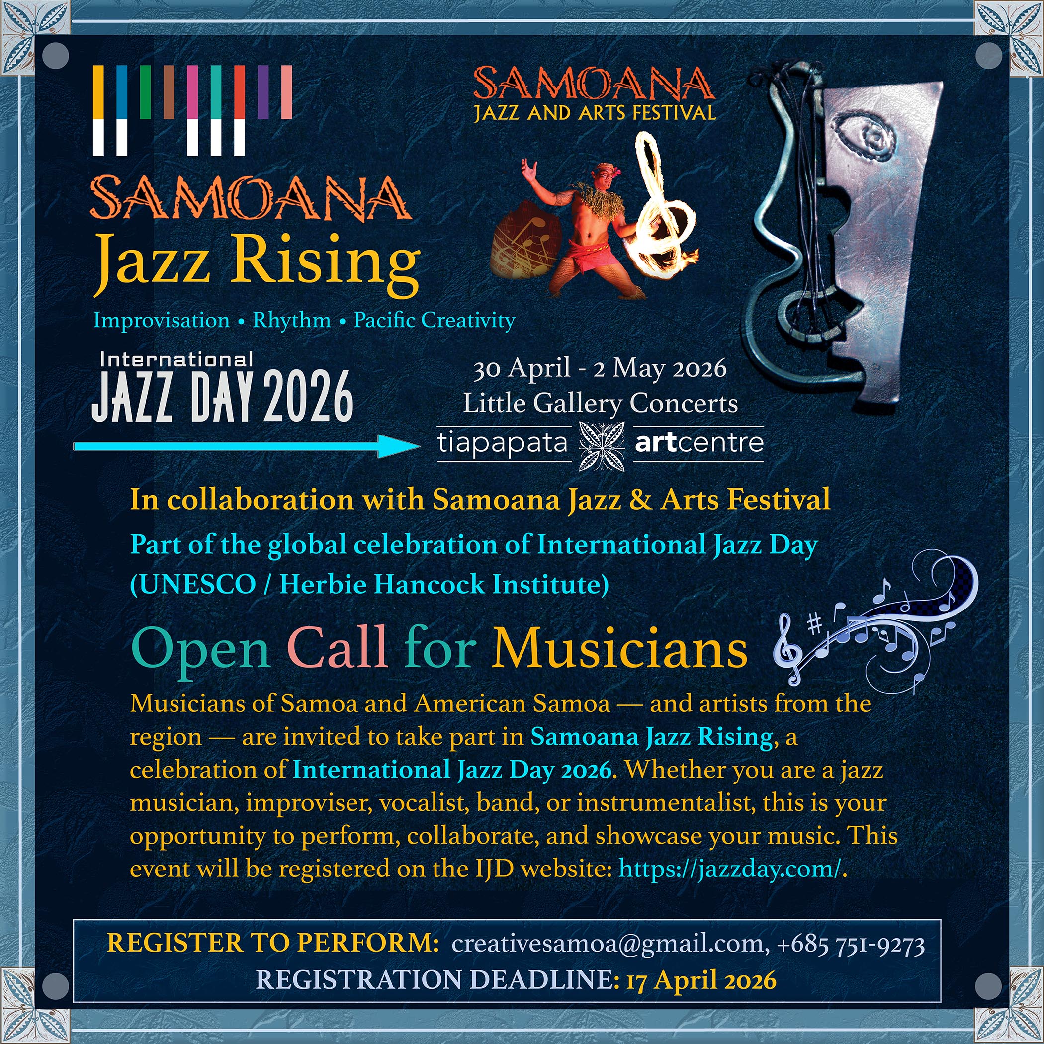 Samoana Jazz Rising – International Jazz Day Samoa 2026 will be celebrated as a Little Gallery Concert at the Tiapapata Art Centre on 30 April, with the possibility of additional performances at other venues on 1 and 2 May. Musicians from Samoa, American Samoa and visiting artists from the region are invited to participate through an open call celebrating improvisation, rhythm and Pacific creativity. Vocalists, bands and instrumentalists inspired by jazz, blues, soul and Pacific musical traditions will collaborate and perform together. The program is organized by the Tiapapata Art Centre in collaboration with the Samoana Jazz & Arts Festival.