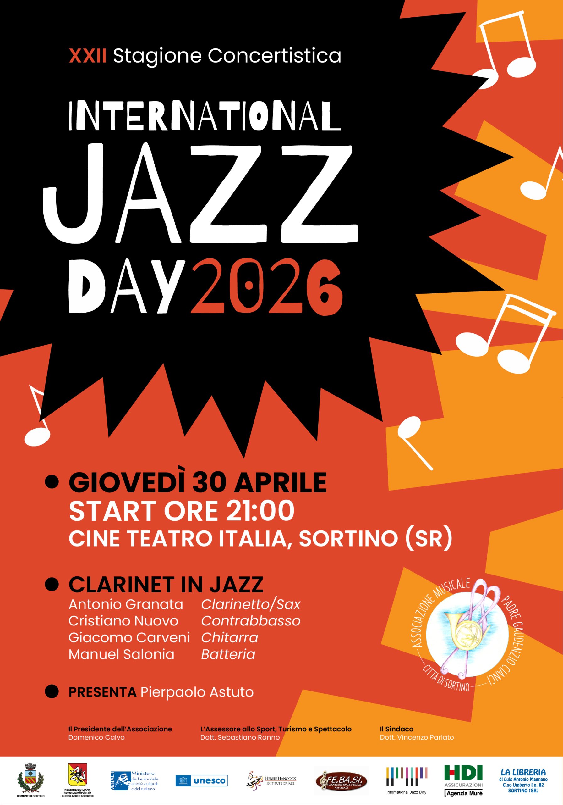 Il Comune di Sortino celebra la giornata Internazionale del Jazz con il Concerto di Primavera, primo appuntamento della XXII Stagione Concertistica, a cura dell’Associazione Musicale “Padre Gaudenzio Cianci - Città di Sortino”.