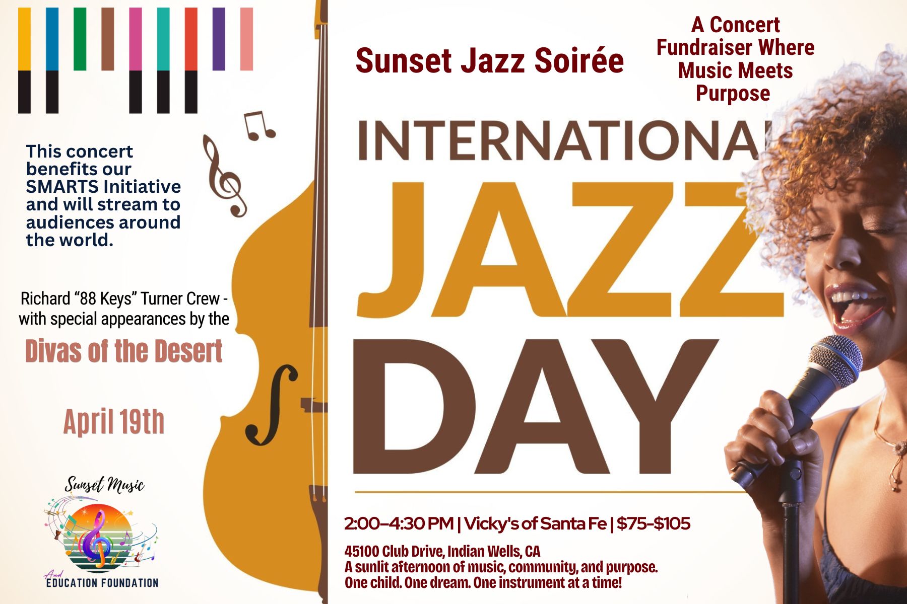 Sunset Jazz Soirée – Live from Palm Springs is an International Jazz Day celebration presented by the Sunset Music and Education Foundation. Filmed at the iconic Vicky’s of Santa Fe, this unforgettable afternoon features Richard “88 Keys” Turner’s Crew with special appearances by the Divas of the Desert, delivering spontaneous, world-class jazz at its finest. More than a concert, this is music with purpose—supporting the SMARTS Initiative, which provides instruments, scholarships, and mentorship to young musicians across the Coachella Valley. From Palm Springs to the global stage, this is jazz alive, soulful, in the moment—and filled with surprise, connection, and pure musical joy.