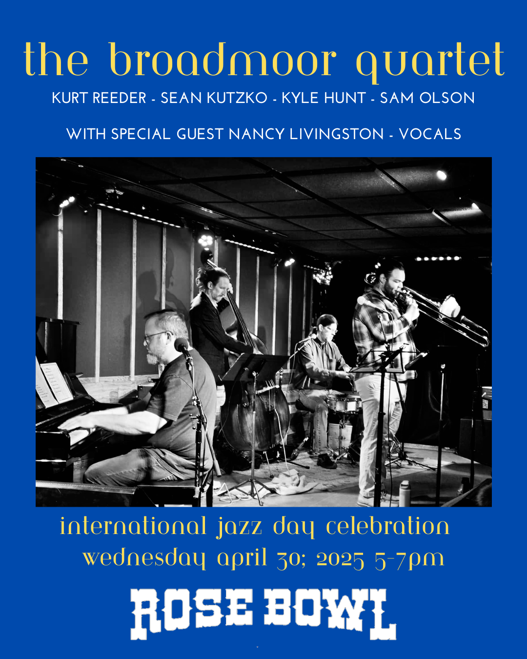 Celebrate International Jazz Day at the Rose Bowl! The Broadmoor Quartet features the lighter side of jazz with unique instrumentation and a blend of standards, Brazilian bossa, and an adventurous pop tune or two. Featuring Kurt Reeder (piano), Sean Kutzko (percussion), Sam Olson (bass), and the return of Kyle Hunt (trombone) to the stage! Special appearance by vocalist Nancy Livingston.