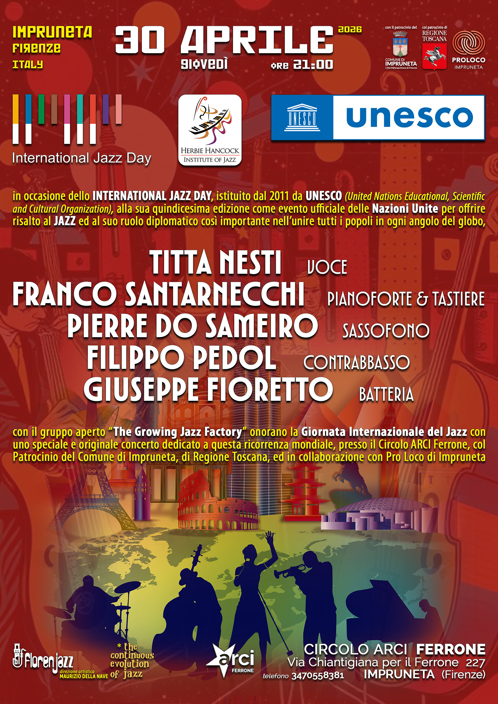On the occasion of INTERNATIONAL JAZZ DAY, established in 2011 by UNESCO, the open group "The Growing Jazz Factory" honors this Jazz Day with a special original concert dedicated to this global event! Exceptionally featuring TITTA NESTI (vocals), FRANCO SANTARNECCHI (piano), PIERRE DO SAMEIRO (saxophone), FILIPPO PEDOL (double bass), GIUSEPPE FIORETTO (drums), they have come together to offer their jazz music (including historic and important pieces) on this beautiful international occasion, for a continuous evolution of jazz! Organized by designer Maurizio Della Nave together with the Circolo ARCI Ferrone. With the patronage of the Comune di Impruneta, the patronage of the Regione Toscana, in collaboration with the Pro Loco di Impruneta.
