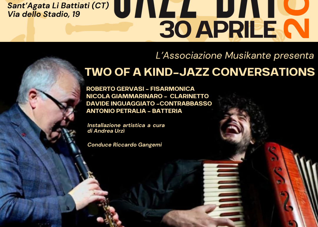 Two of a Kind – Jazz Conversations is a live concert celebrating International Jazz Day 2026, organized by Associazione Culturale Musikante with the support of the Municipality of Sant’Agata Li Battiati. The project features Roberto Gervasi (accordion) and Nicola Giammarinaro (clarinet) as frontline voices, engaging in an intense musical dialogue rooted in bebop language and … Continue reading Two of a Kind – Jazz Conversations
