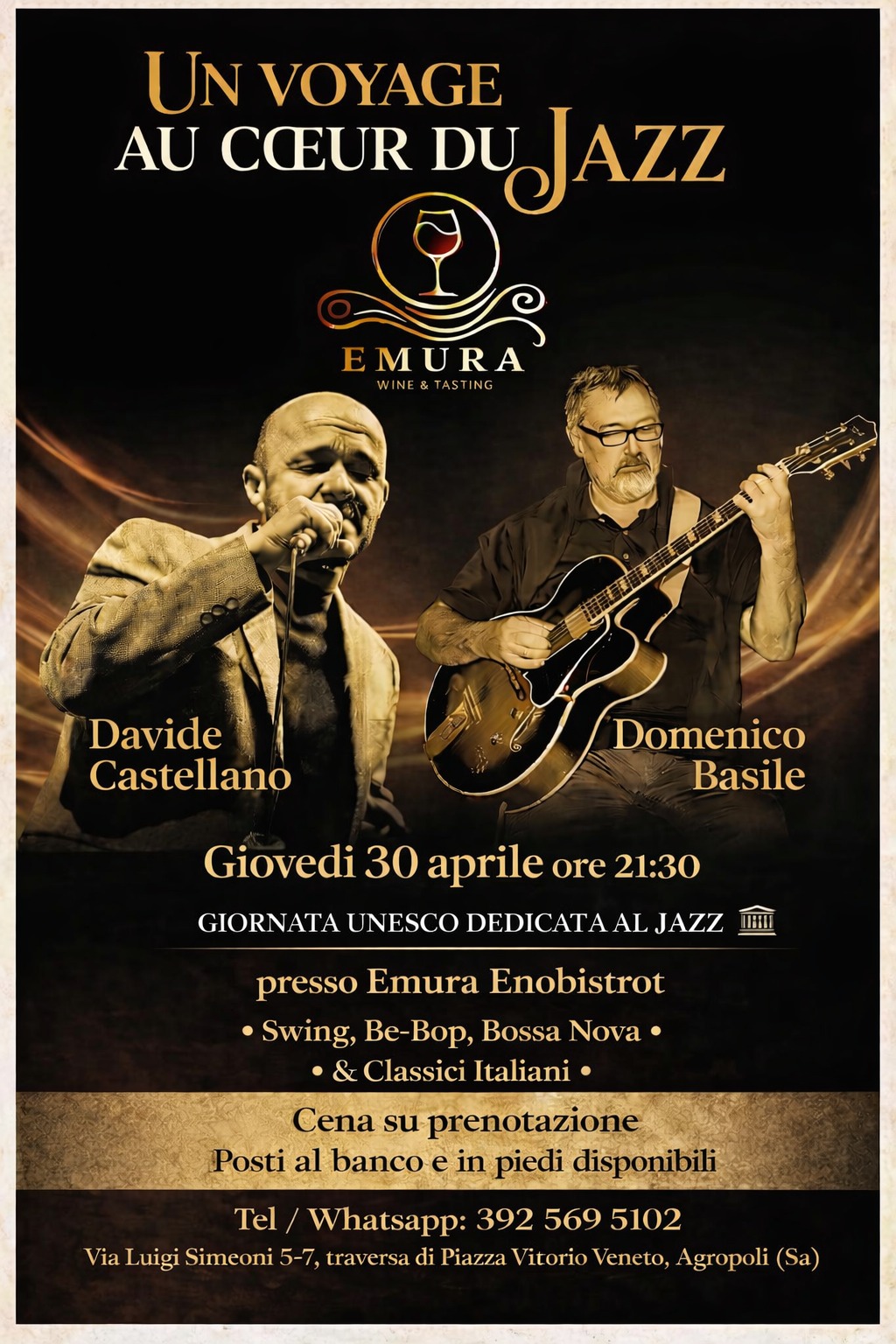 Un percorso sonoro tra Swing, Be-Bop, Bossa Nova e grandi classici della musica italiana, pensato per accompagnarvi in un’atmosfera intima e coinvolgente.