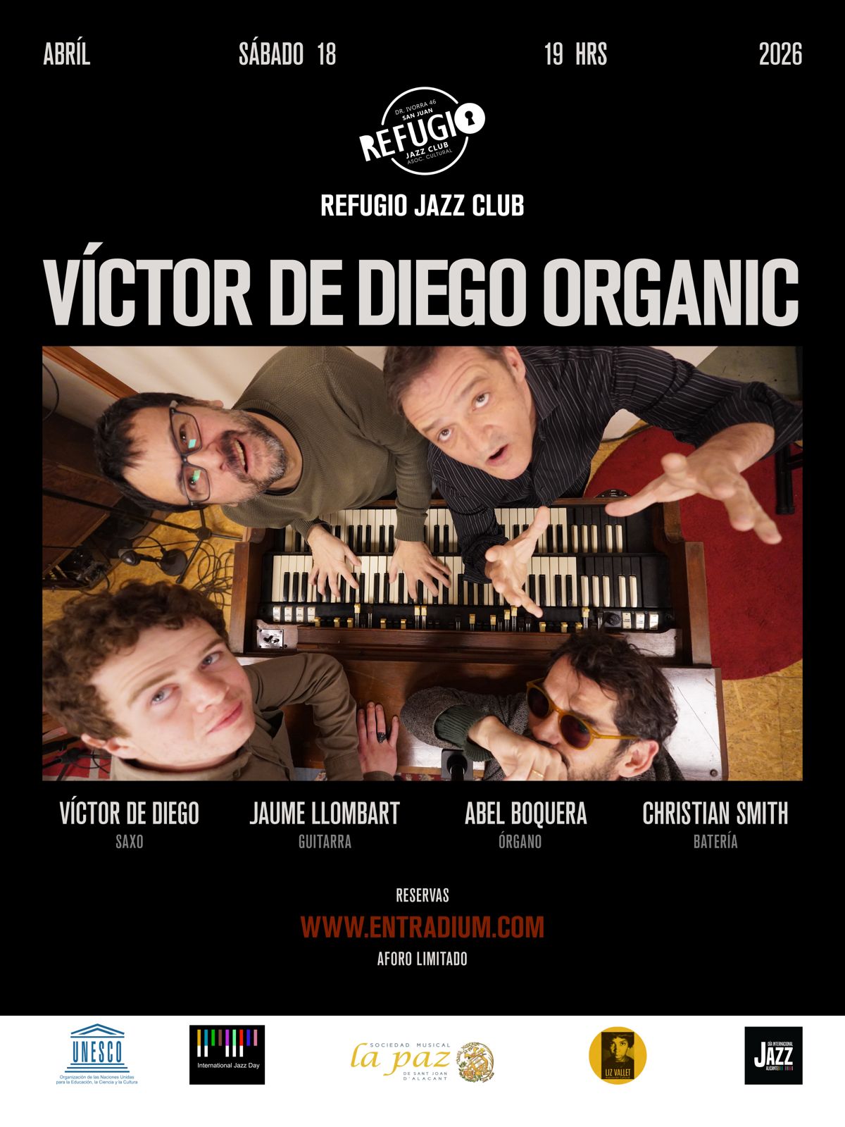 Víctor de Diego Organic Quartet es una formación liderada por el destacado saxofonista bilbaíno Víctor de Diego, caracterizada por su sonido enérgico basado en la clásica instrumentación de jazz (saxo, organo, guitarra y batería). El cuarteto, con base en Barcelona, explora estándares de jazz y composiciones originales con una sonoridad profunda.
